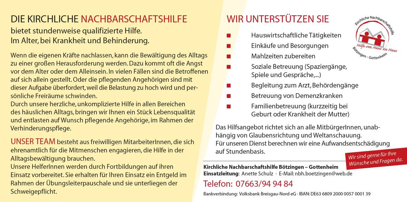 Die kirchliche Nachbarschaftshilfe unterstützt Menschen in ihren häuslichen Aktivitäten, Tagesstrukturen sowie beim Pflegen sozialer Kontakte.