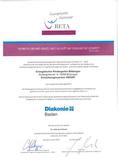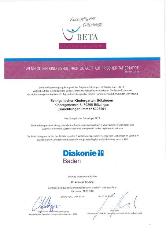 Der Kindergarten setzt die im Bundesrahmenhandbuch II vorgegebenen Standards und Qualitätsmerkmale systematisch und transparent in der täglichen Arbeit um und wurde daher zertifiziert mit dem evangelischen Gütesiegel "Beta" - geprüfte Qualität.