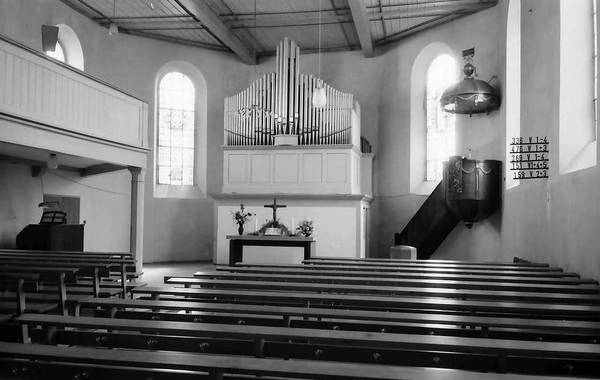 Das obige Foto zeigt den Innenraum der Kirche im Jahr 1969 mit der Kanzel aus dem Jahr 1808, sowie der Orgel, die bis 1993 im Einsatz war.