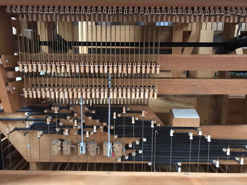 Die Anlage für unsere Orgel wird bis zu 10.000 Registerkombinationen speichern können. Die Taster sind dezent unterhalb der Manuale untergebracht und verändern daher den optischen Gesamteindruck der Orgel nicht. Weitere Schalter (sog. „Pistons“) zur Betätigung mit dem Fuß sind unten vor den Pedalen montiert.